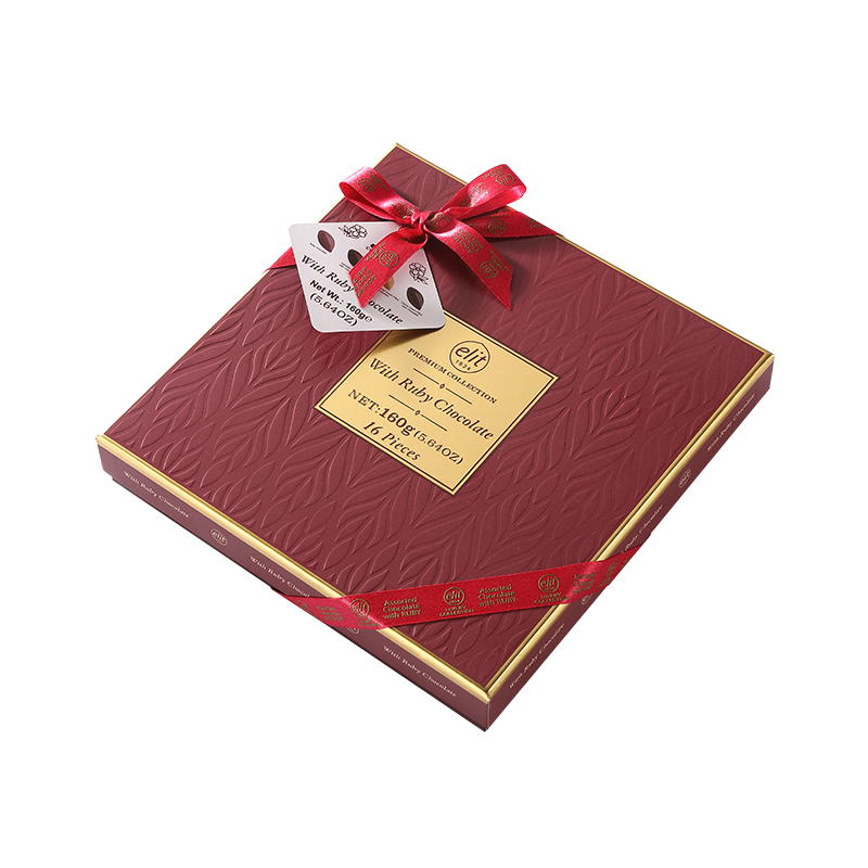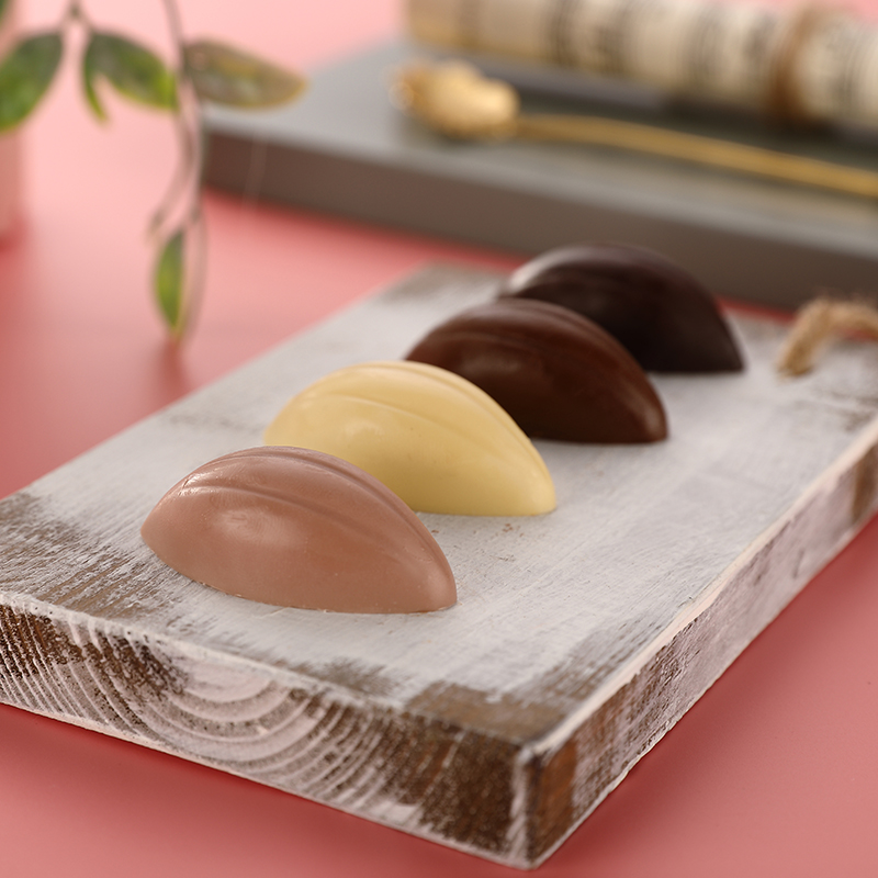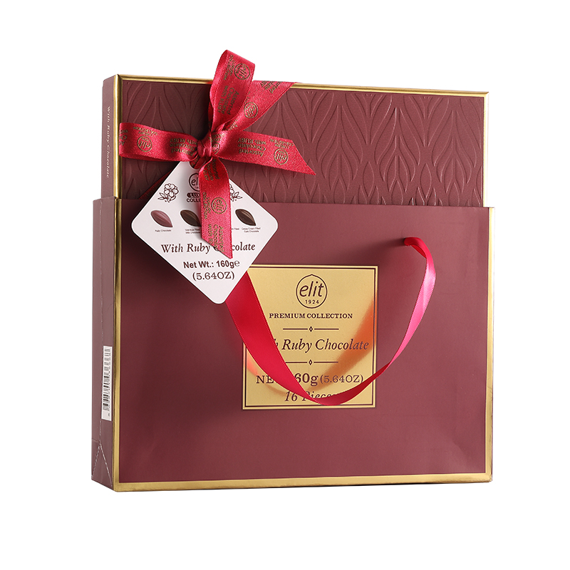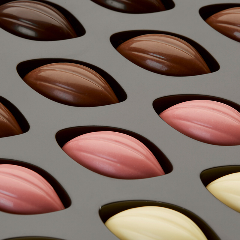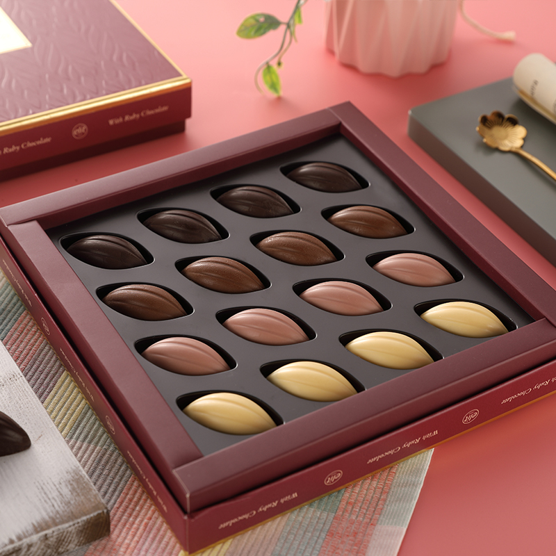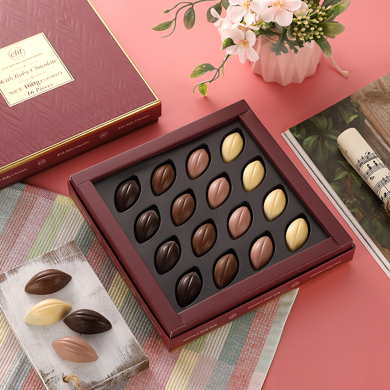 Elit Ruby, Dark, Milk and White Chocolate Praline in Cocoa Bean Shape (Burgundy) in Cocoa Bean Shape